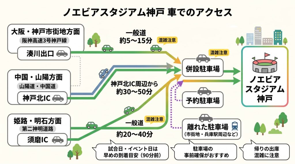 ノエビアスタジアム神戸へ車で向かう方法|神戸市内からのアクセスと到着前に確認したいポイント