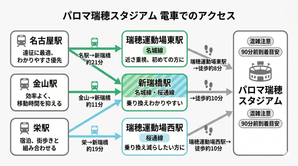ここでは、対象都市ごとに代表駅ベースで、パロマ瑞穂スタジアムへ向かう最速ルートと最安ルートを整理しました。