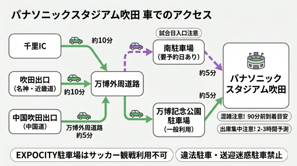 パナソニックスタジアム吹田へ車で向かう方法|出発前に押さえたいアクセスと混雑のポイント