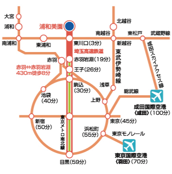 都内から行く日は、東京メトロ南北線の直通で赤羽岩淵から埼玉高速鉄道にそのまま乗って浦和美園まで出ました。