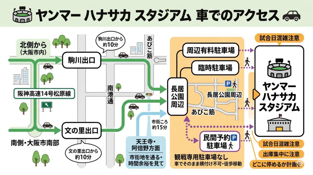 YANMAR HANASAKA STADIUMへ車で向かう方法|駐車場と混雑を見越して長居公園周辺へ寄せるコツ